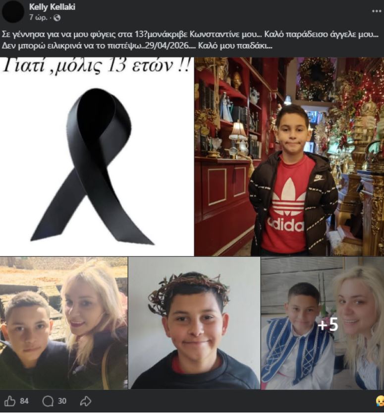 «Σε γέννησα για να μου φύγεις στα 13; Mονάκριβε Κωνσταντίνε μου… Καλό παράδεισο άγγελε μου… Δεν μπορώ ειλικρινά να το πιστέψω..29/04/2026…. Καλό μου παιδάκι…», γράφει στην ανάρτησή της, την οποία συνοδεύει με φωτογραφίες, η μητέρα του 13χρονου.