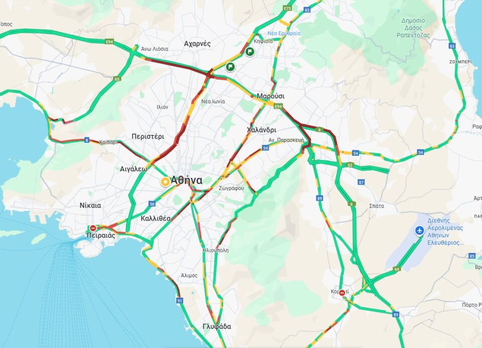 Στα «κόκκινα» είναι η Αττική από την κίνηση είναι η λεωφόρος Κηφισού, από το ύψος του Αιγάλεω μέχρι και την Νέα Φιλαδέλφεια, στη Μεσογείων αλλά και στη Λεωφόρο Κηφισίας, υπάρχει μποτιλιάρισμα κατά τμήματα, κυρίως στο ύψος του Ψυχικού και στο ύψος του Χαλανδρίου.