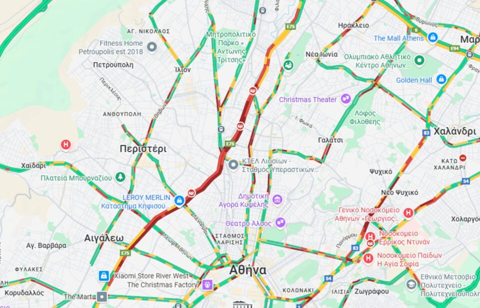 Αυξημένη κίνηση παρατηρείται στην άνοδο του Κηφισού, όπου σύμφωνα με τον χάρτη της Google υπάρχουν αρκετά τροχαία.