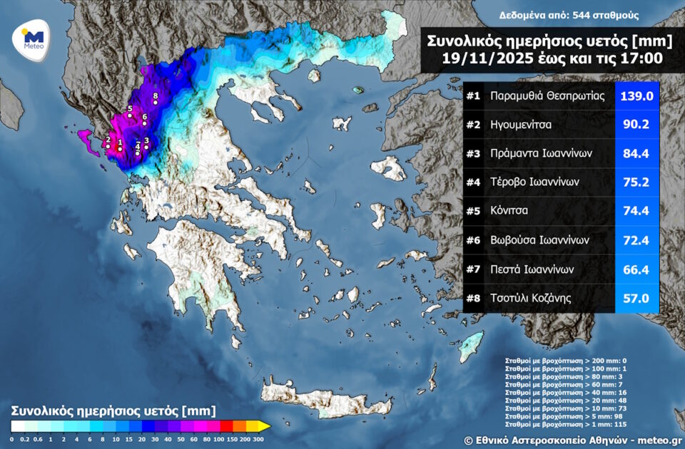 Σύμφωνα με τις καταγραφές του δικτύου αυτόματων μετεωρολογικών σταθμών του meteo.gr / Εθνικού Αστεροσκοπείου Αθηνών, το μεγαλύτερο ύψος βροχής έως τις 17:00 της Τετάρτης καταγράφηκε στην Παραμυθιά Θεσπρωτίας και ήταν ίσο με 139 χιλιοστά.