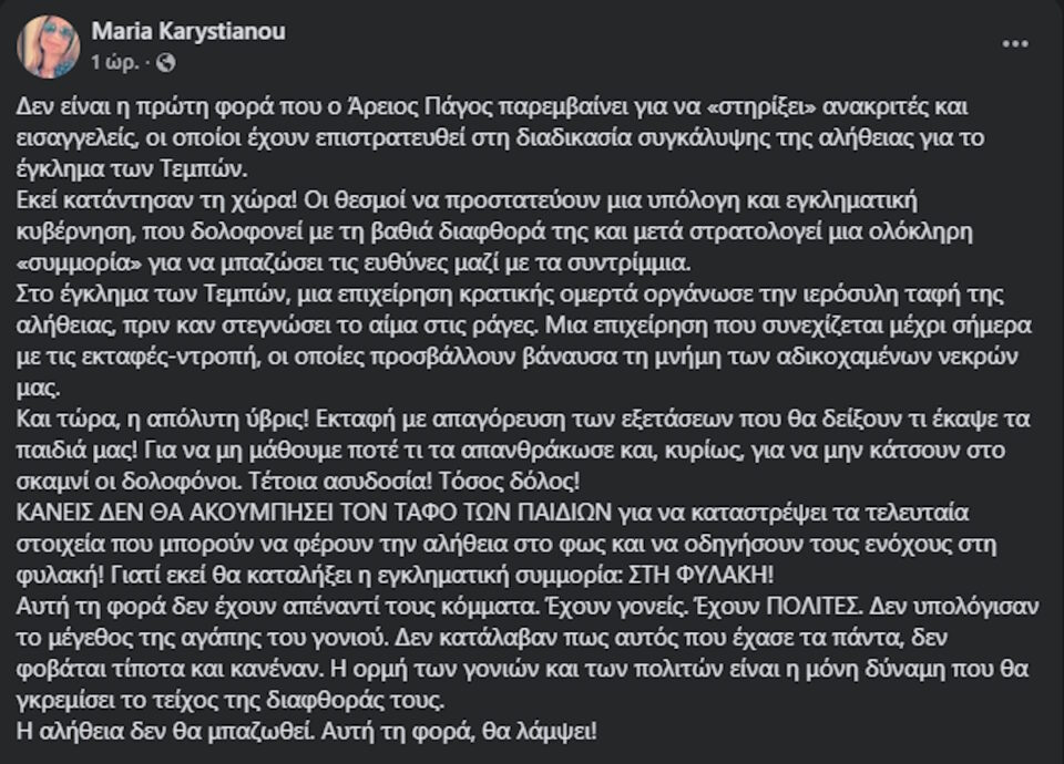 Μια οργισμένη ανάρτηση έκανε η Μαρία Καρυστιανού στον προσωπικό της λογαριασμό στο Facebbok, κάνοντας αναφορά στις εκταφές των σορών των θυμάτων των Τεμπών, στην οποία μίλησε για μια ακόμα φορά λόγο «για συγκάλυψη εγκλήματος από την ελληνική Δικαιοσύνη».