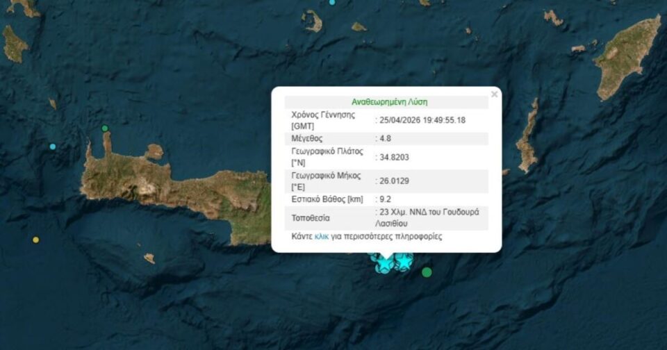 Νέα σεισμική δόνηση ταρακούνησε το Λασίθι το βράδυ του Σαββάτου 25.04.2026, με τον σεισμό να έχει μέγεθος 4,8 βαθμών της κλίμακας Ρίχτερ.