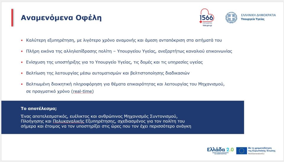 Ο μηχανισμός θα εξυπηρετεί στην πρώτη φάση: Ενημέρωση για εφημερίες νοσοκομείων και φαρμακείων Κλείσιμο ραντεβού σε όλες τις δομές πρωτοβάθμιας υγείας.