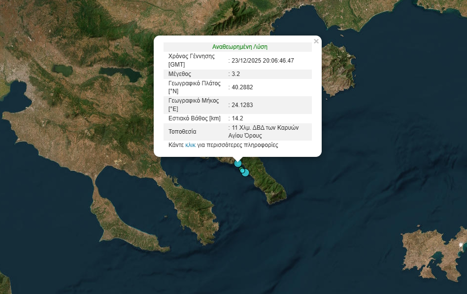 Σεισμός μεγέθους 3,2 της κλίμακας Ρίχτερ σημειώθηκε στις Καρυές του Αγίου Όρους στις 10:06 το βράδυ της Τρίτης (23.12.2025).