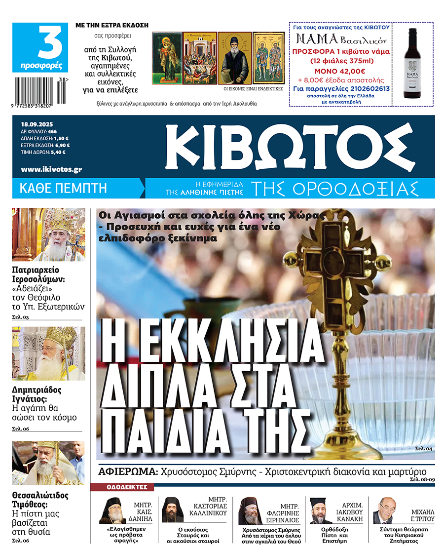 Την Πέμπτη, 18 Σεπτεμβρίου, κυκλοφορεί το νέο φύλλο της Εφημερίδας «Κιβωτός της Ορθοδοξίας»